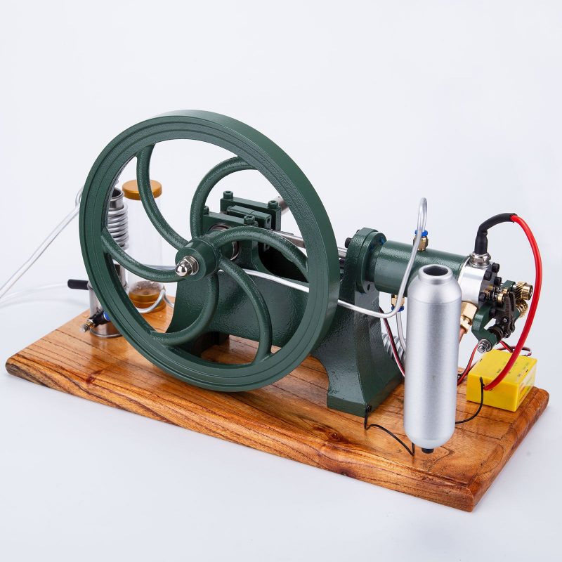 Inspired by the engines that appeared in Europe in the early 1900s, the horizontal four-stroke gas engine, with an extremely distinctive large cast iron flywheel, is made of a large number of cast iron castings and dark green paint treatment on the surface for more retro texture.