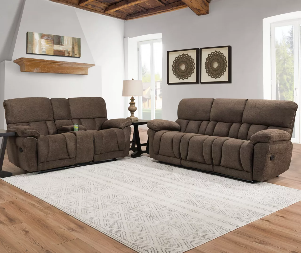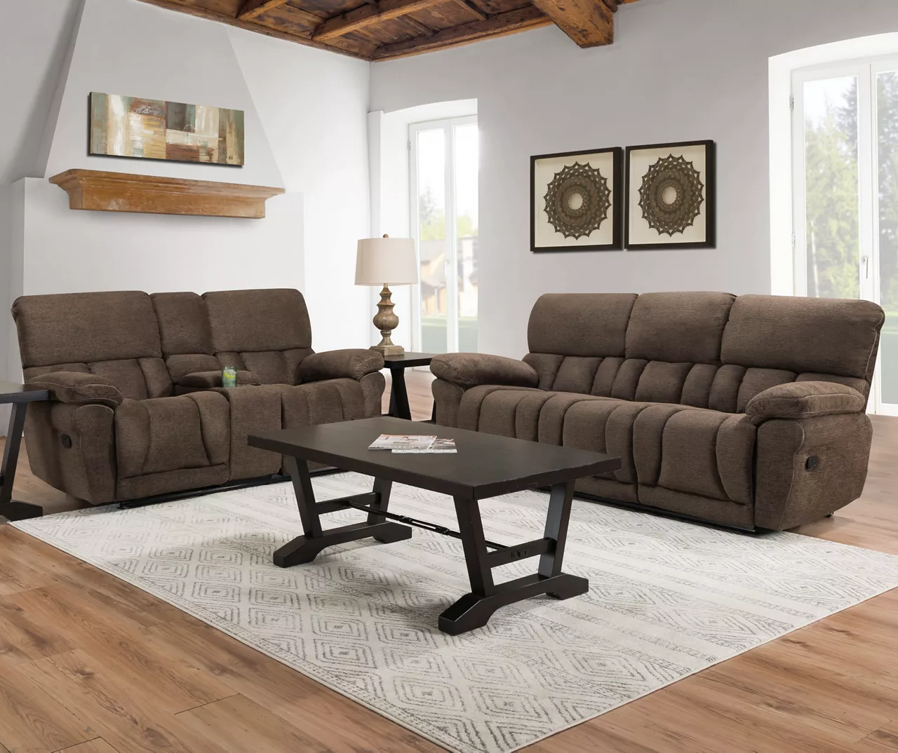 - Double reclining sofa upholstered in a rich chocolate brown fabric